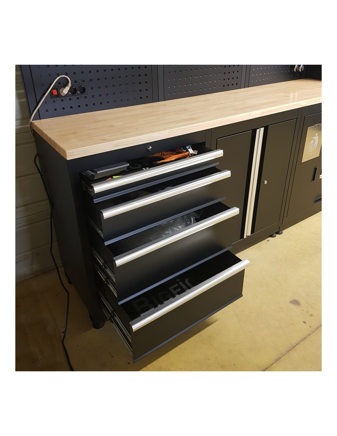 Ce meuble bas avec 4 tiroirs est parfait pour organiser et ranger vos outils dans un espace bien structuré. Ses tiroirs spacieux et robustes permettent un accès facile et rapide à vos équipements, tout en optimisant l’espace de votre atelier.