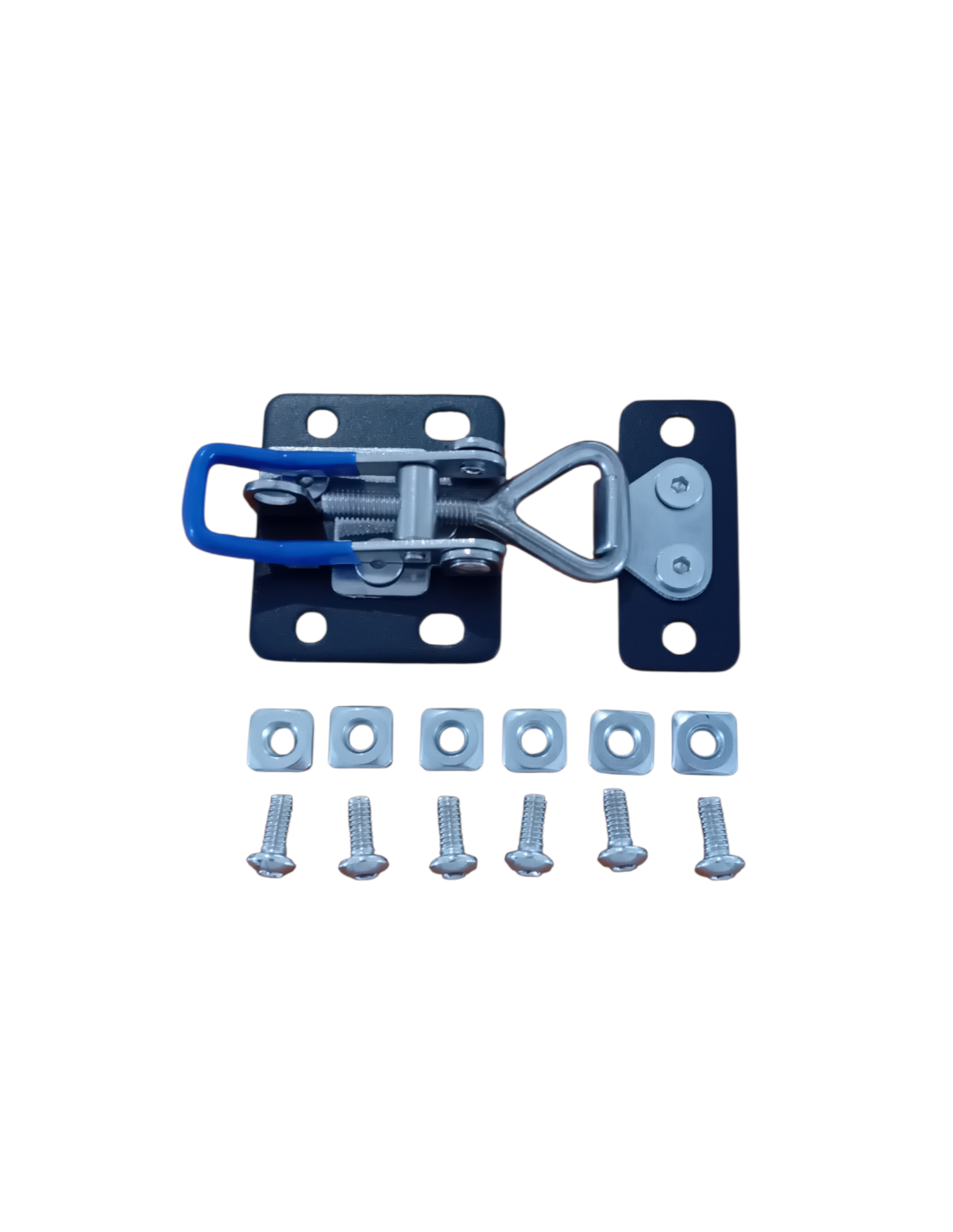 Fermeture réglable, de type grenouillère, fabriquée en acier inoxydable. Livrée avec support et visserie.