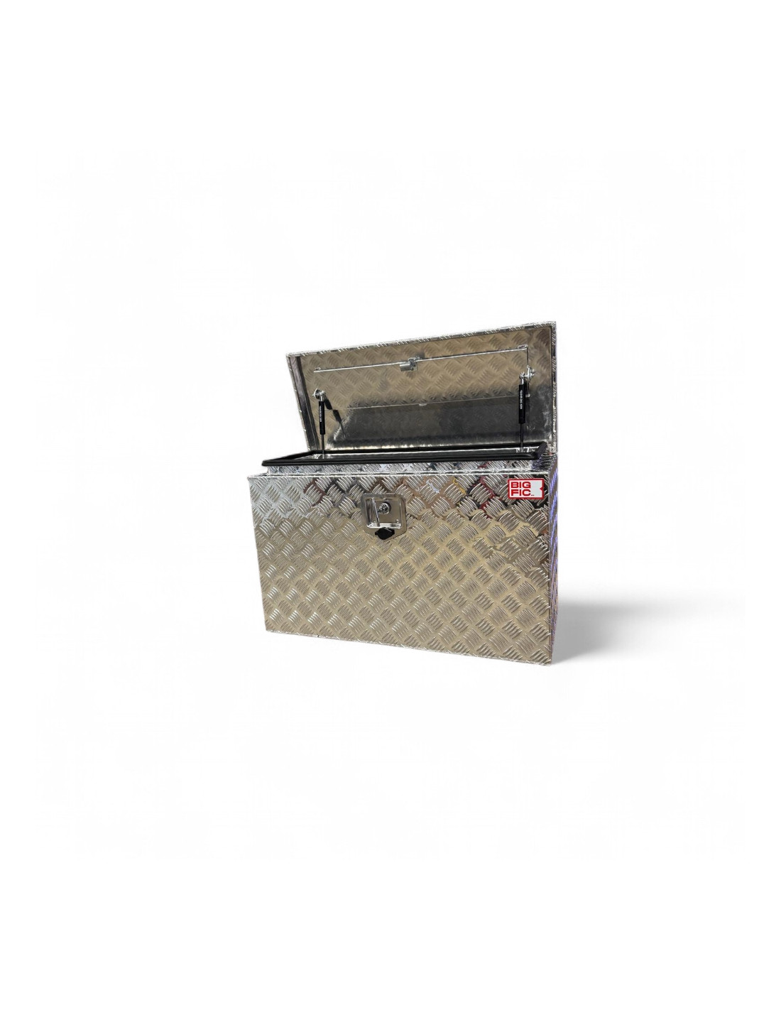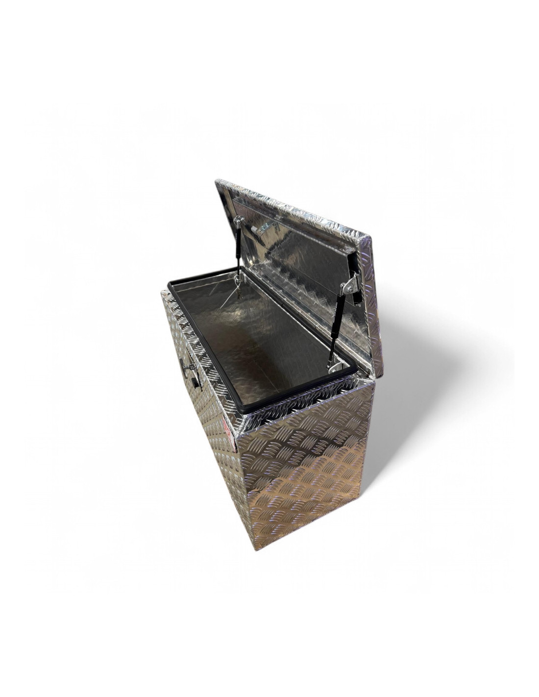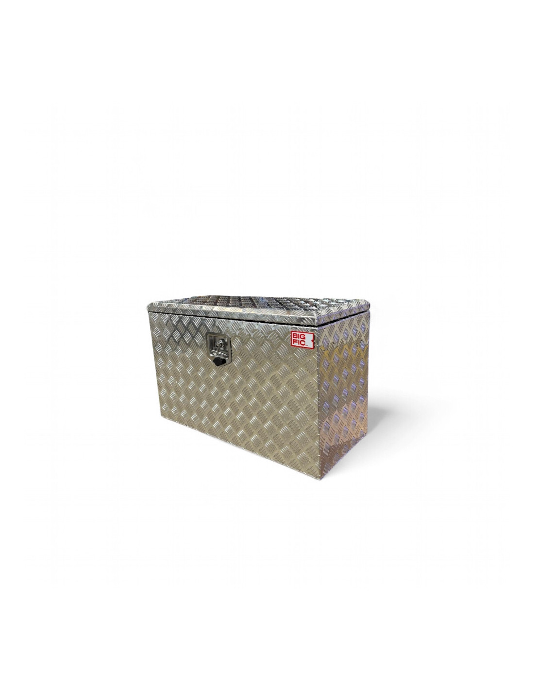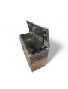 Ce coffre, réalisé en aluminium strié ép. 2.4 mm, est équipé d'un joint d'étanchéité (eau et poussière) et d'une fermeture sécurisée (livré avec 2 clefs).